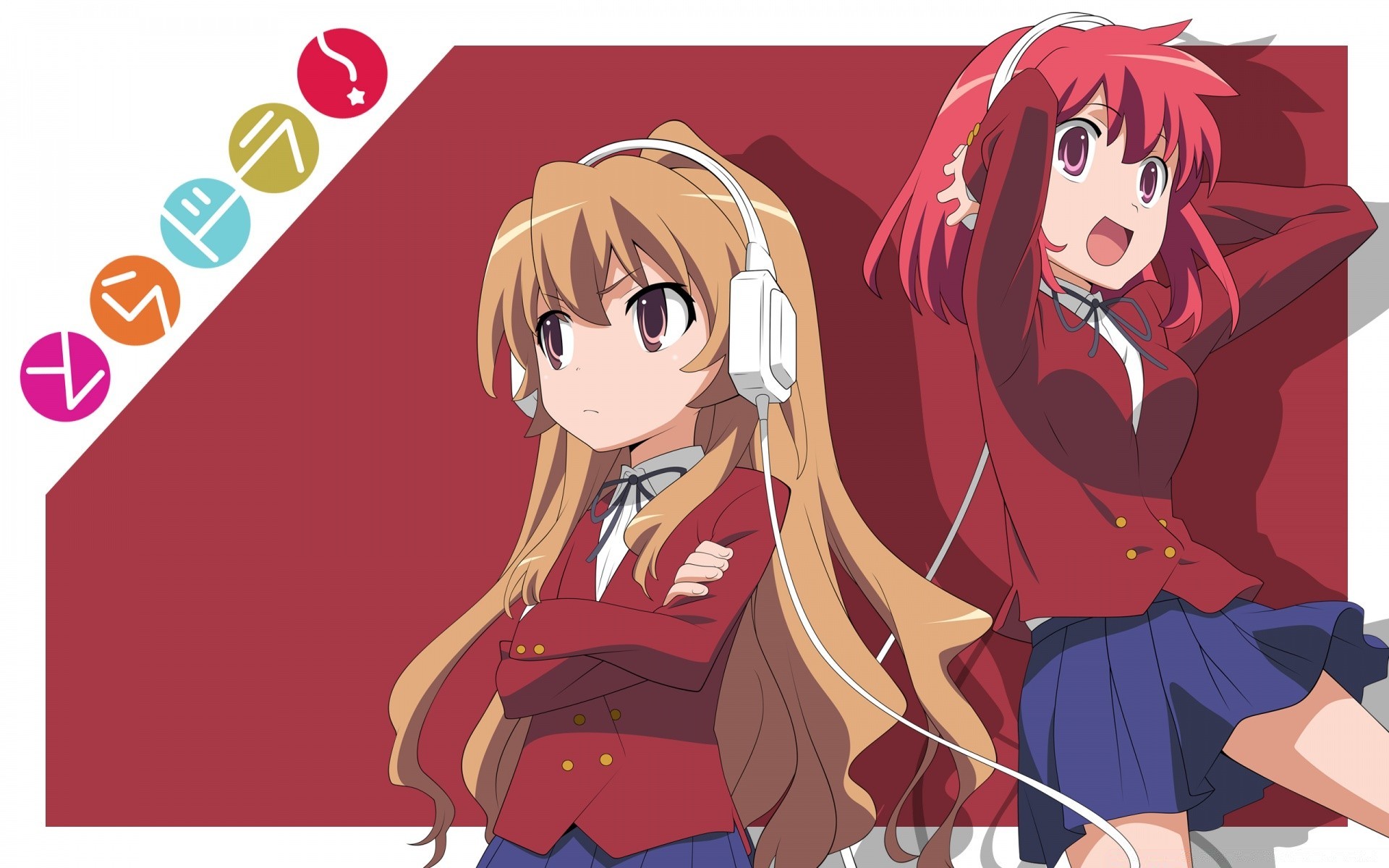 Dziewczyny z anime w słuchawkach na czerwonym tle