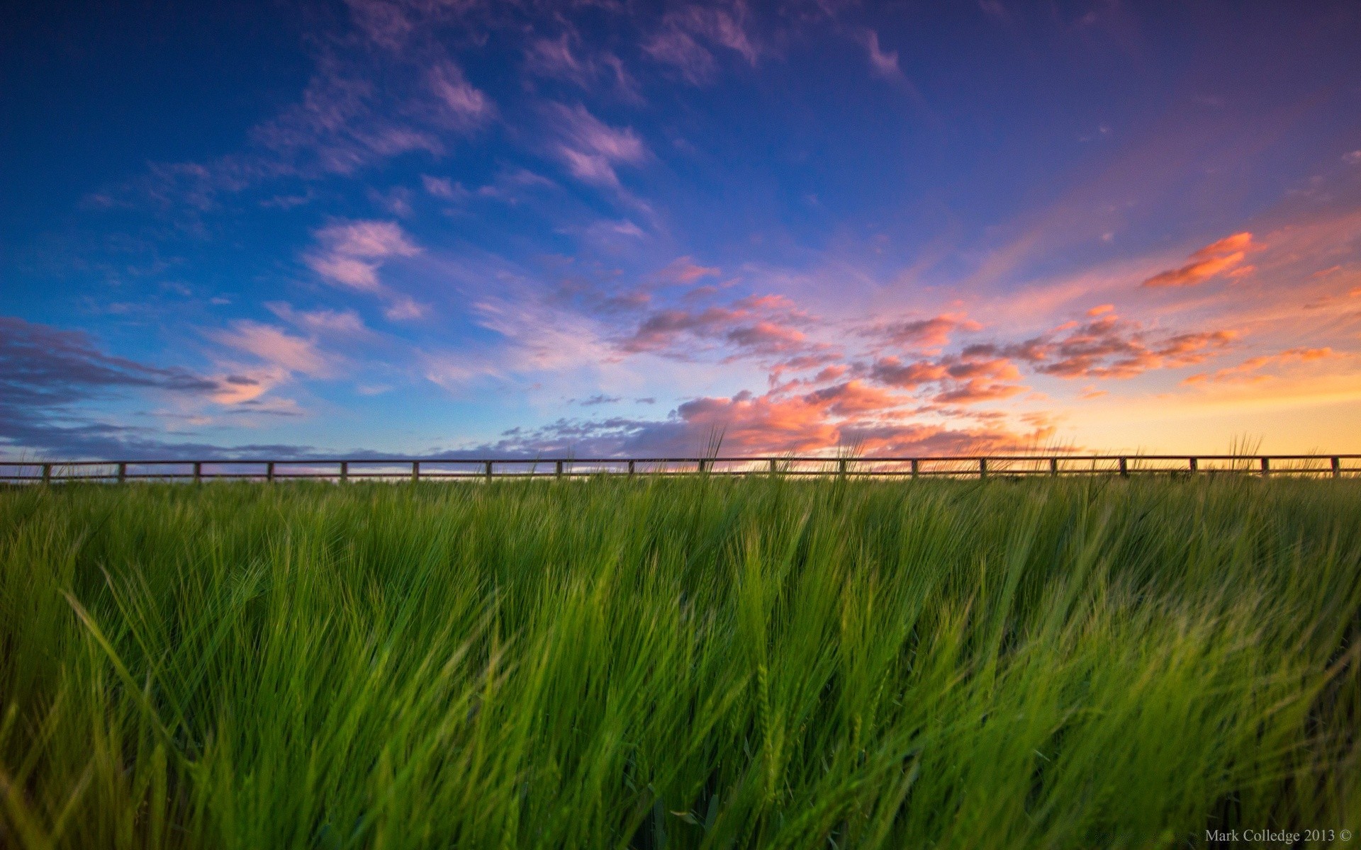 Błękitne niebo oślepiające słońce. Zielone pole oświetlone palącym słońcem