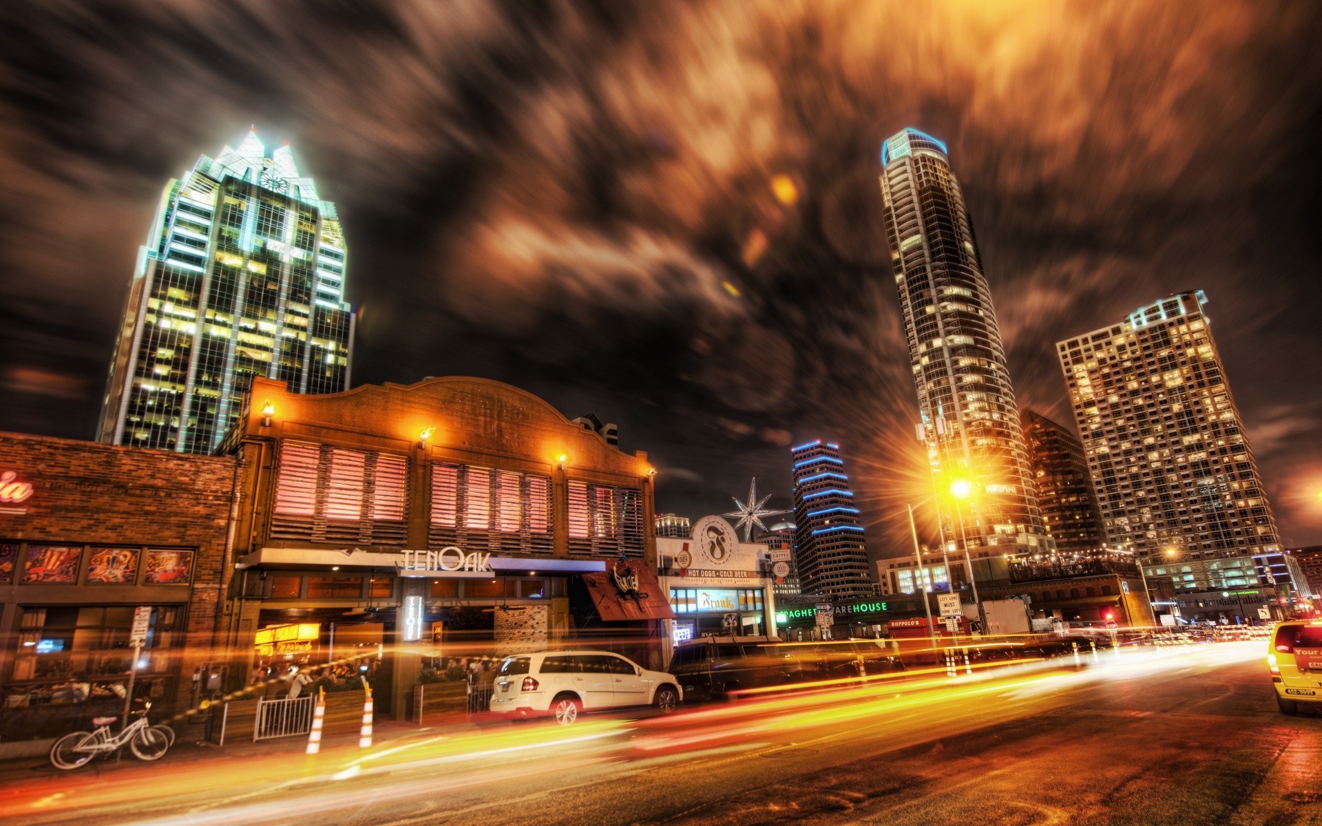 W centrum nocne niebo we mgle otoczone drapaczami chmur w światłach