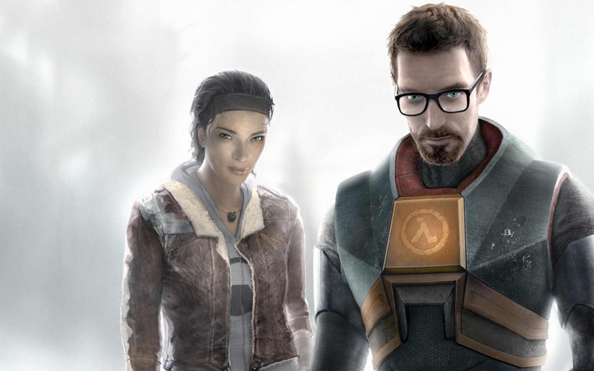 Obraz z gry mężczyzna i kobieta na tle ściany