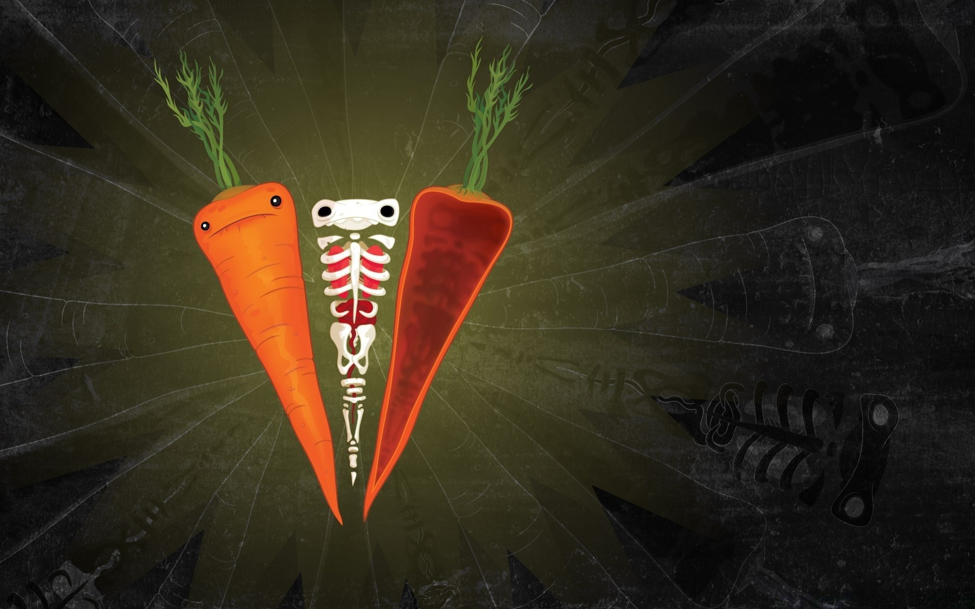 Marchewka z oczami pokrojona na połówki i jej szkieletMarchewka z oczami pokrojona na połówki i jej szkielet