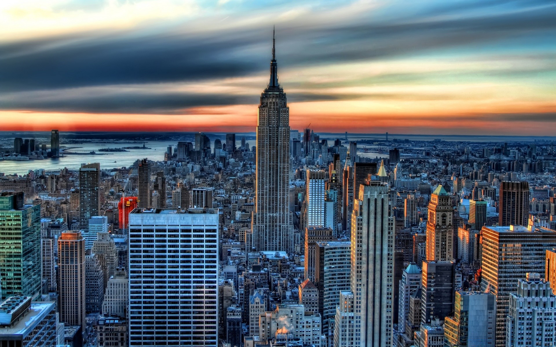 Miejskie drapacze chmur na tle fioletowego zachodu Słońca