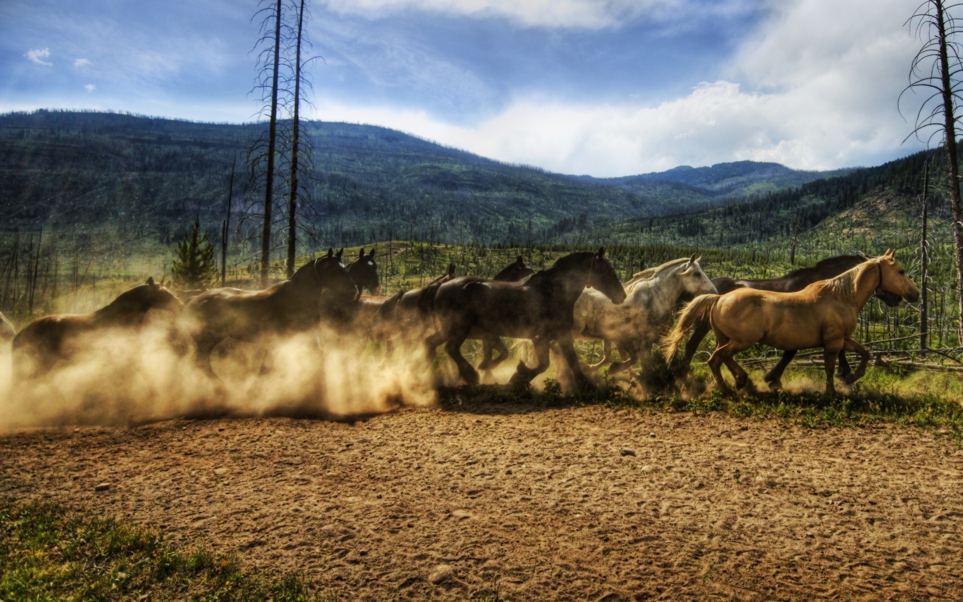 Stado koni biegnie w abstrakcyjnym polu