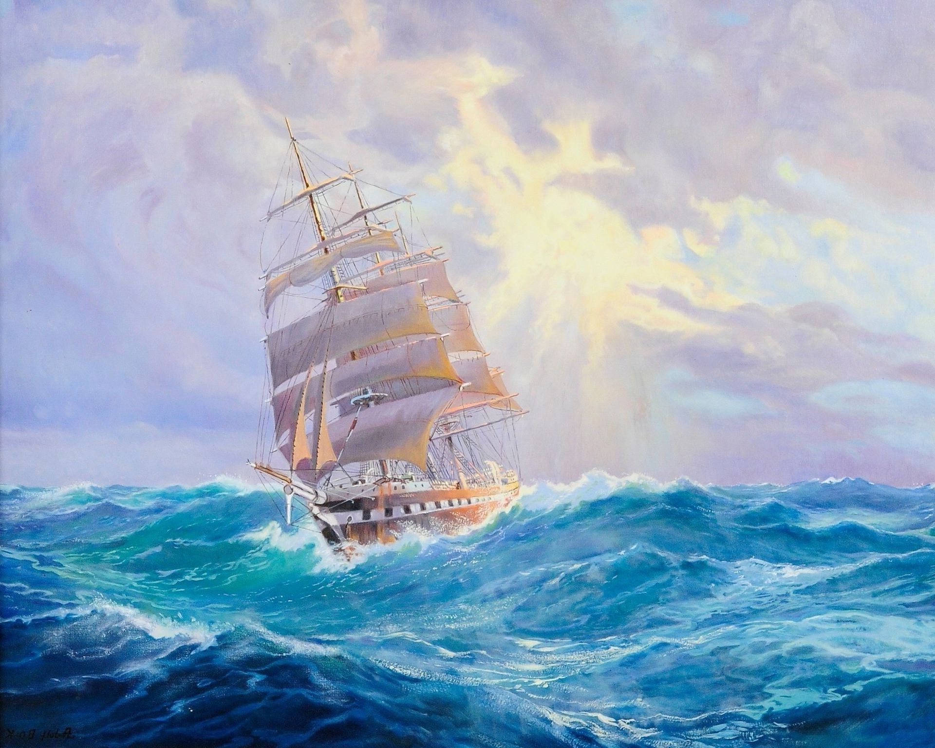 Żaglówka na morzu, rozsypuje fale
