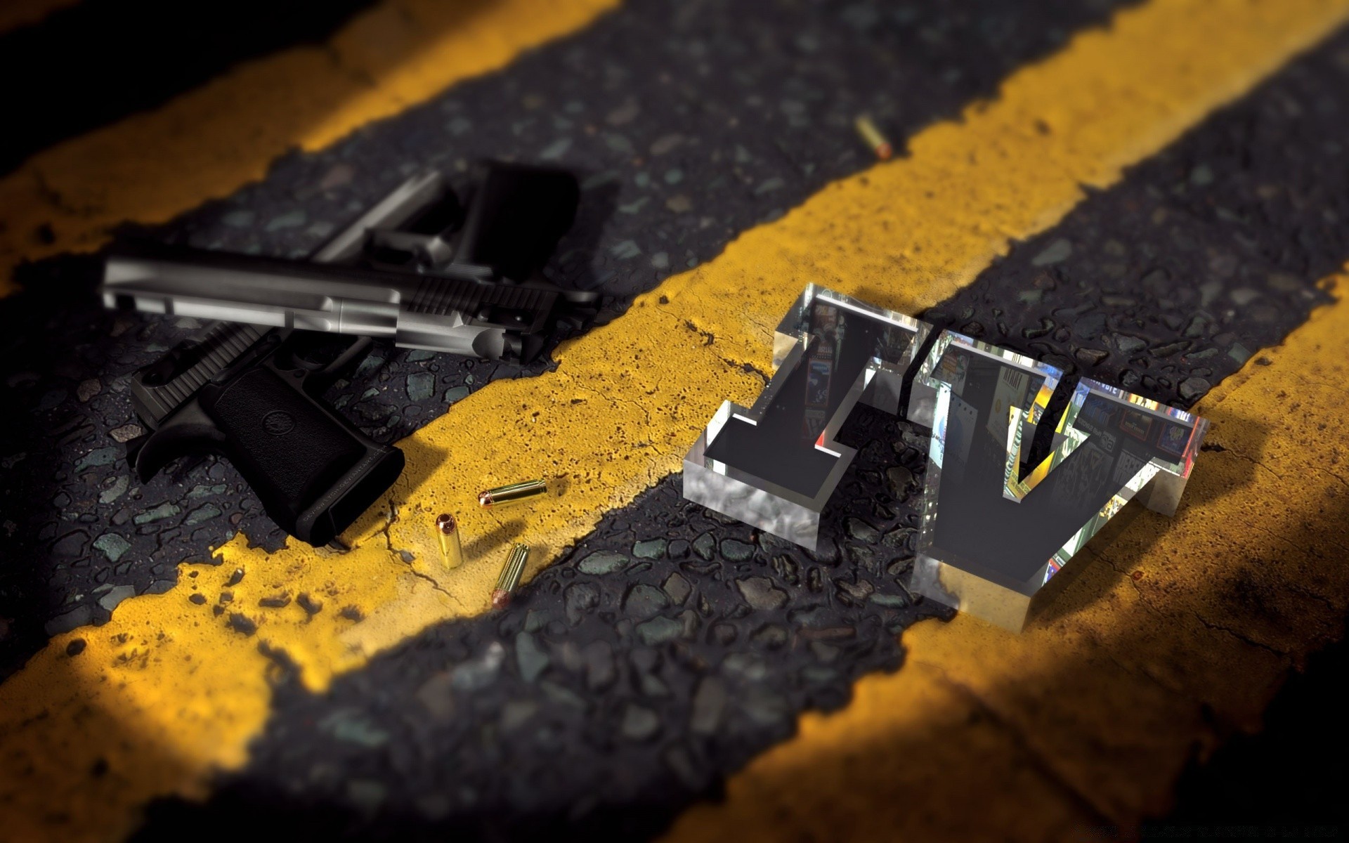 Dwie lufy i naboje na asfalcie z rzymską cyfrą IV