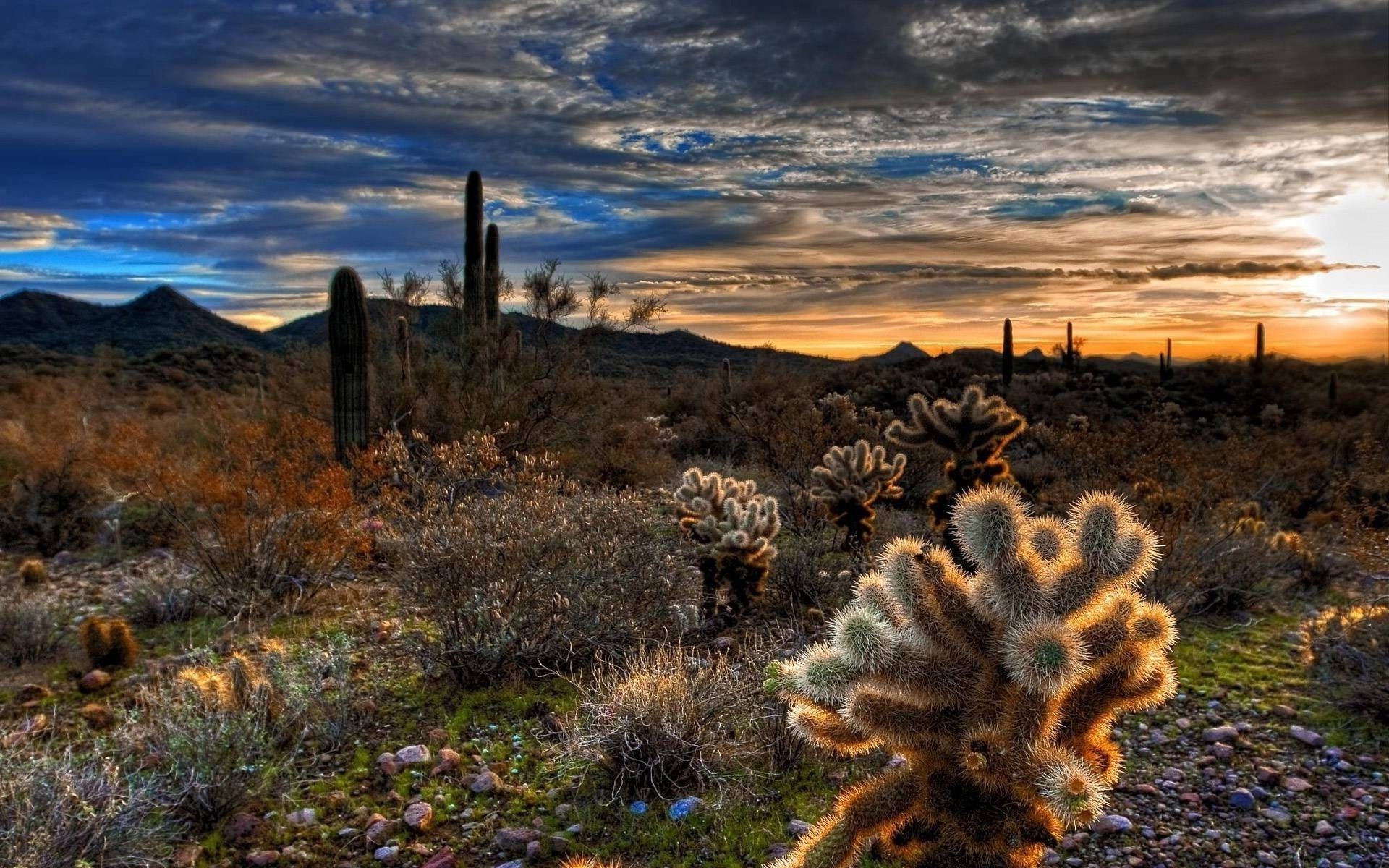 Pustynia z kaktusami. Na niebie jest zachód słońca. fa