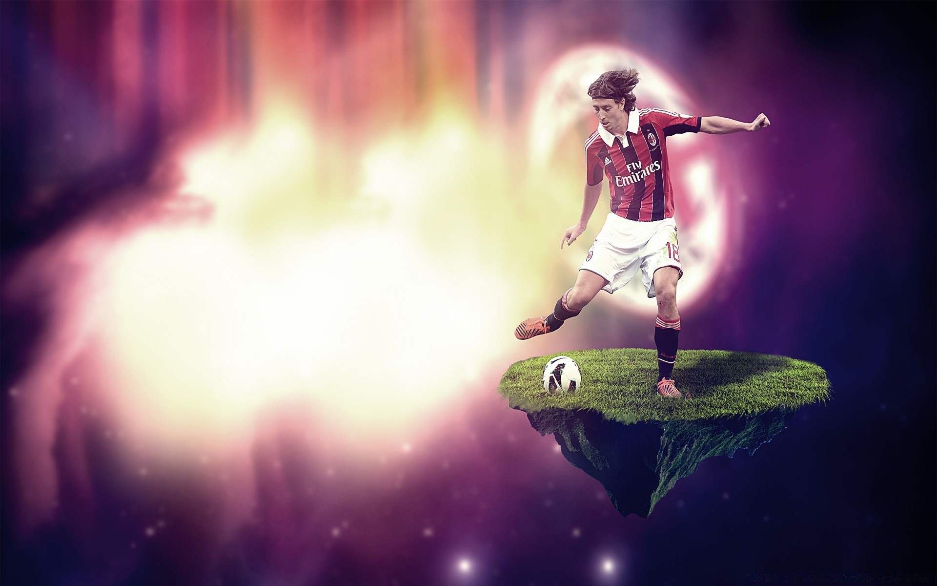 Piłkarz z piłką na tle fali energii
