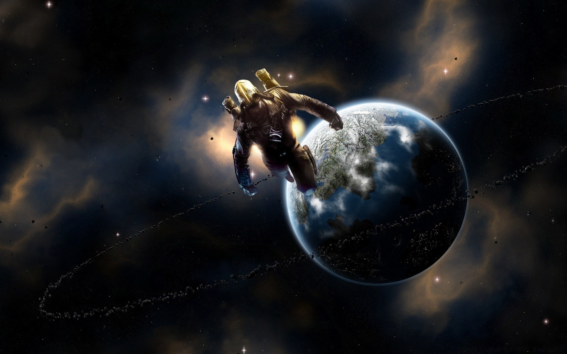 Animacja człowiek w kosmosie obok planety