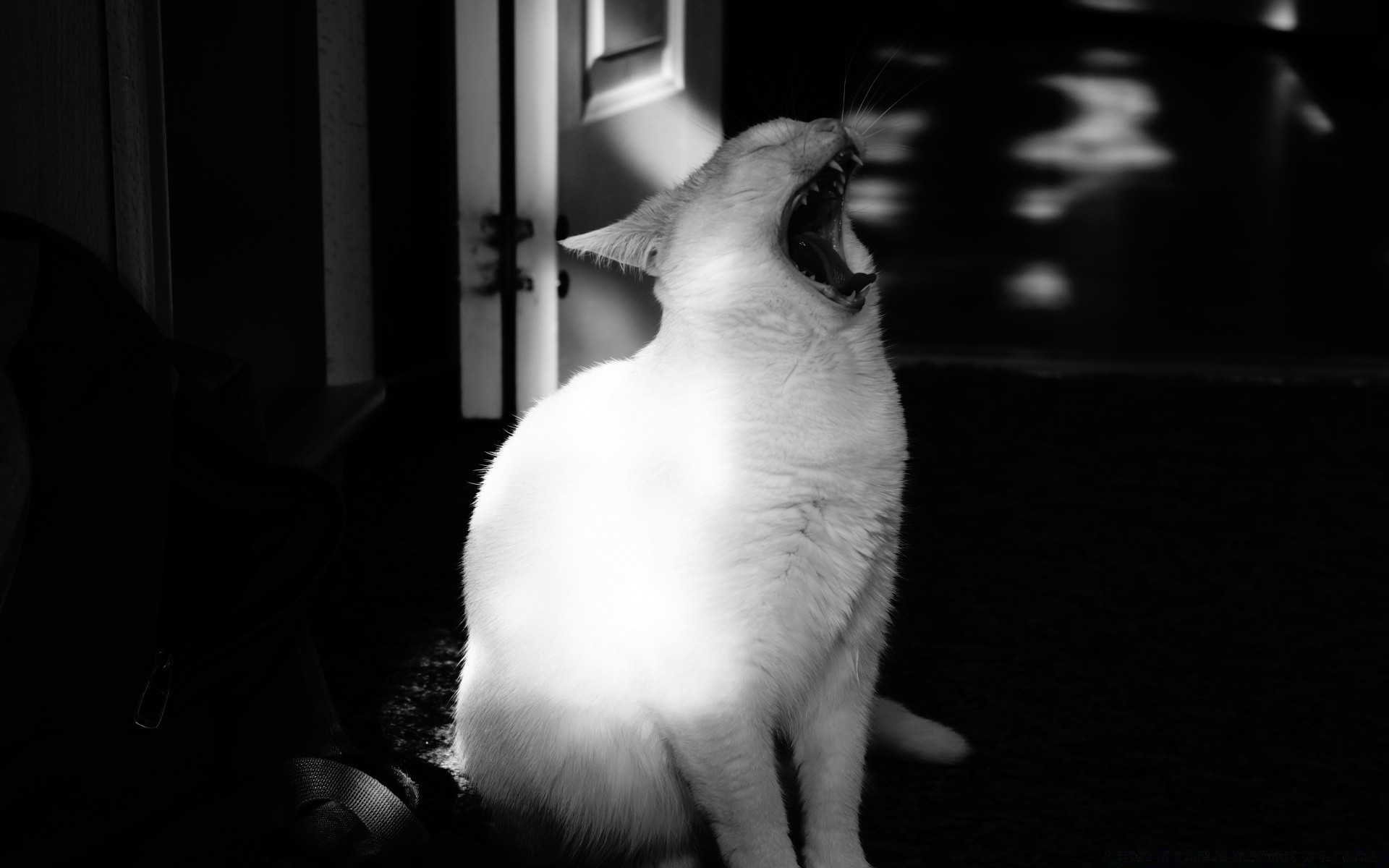 Ziewający biały kot moment