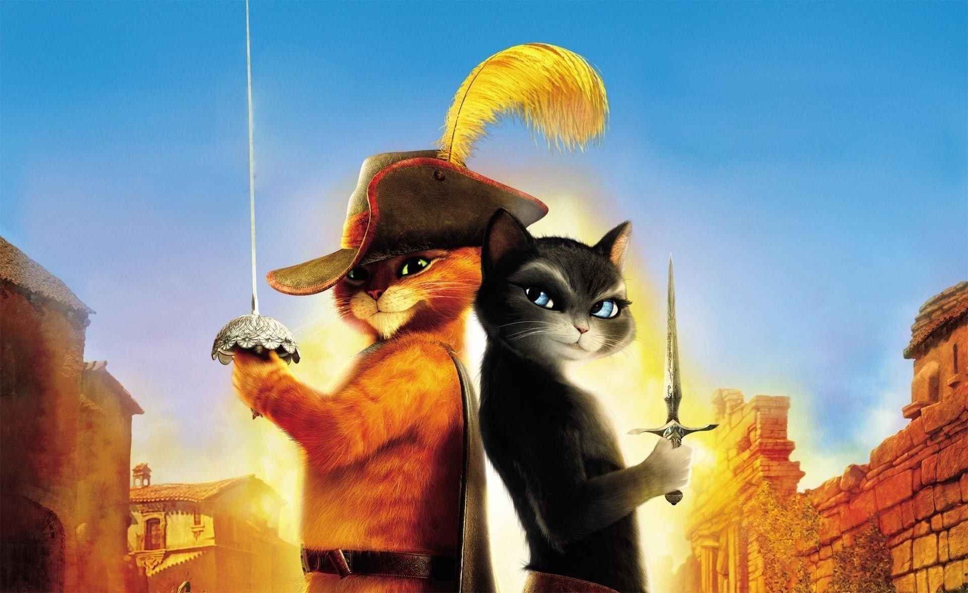 Bohaterowie kreskówek Kot w butach. Kapelusz z piórkiem i szpadą