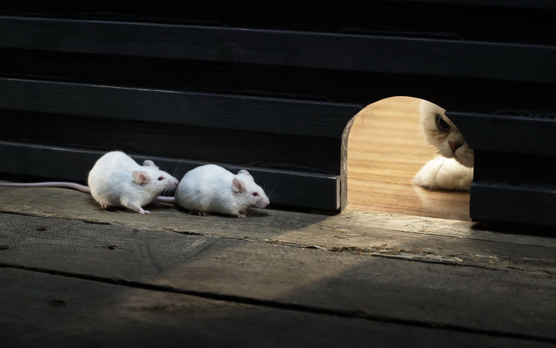 Kot kreskówkowy wychodzi z pudełka z pistoletem Laserowym