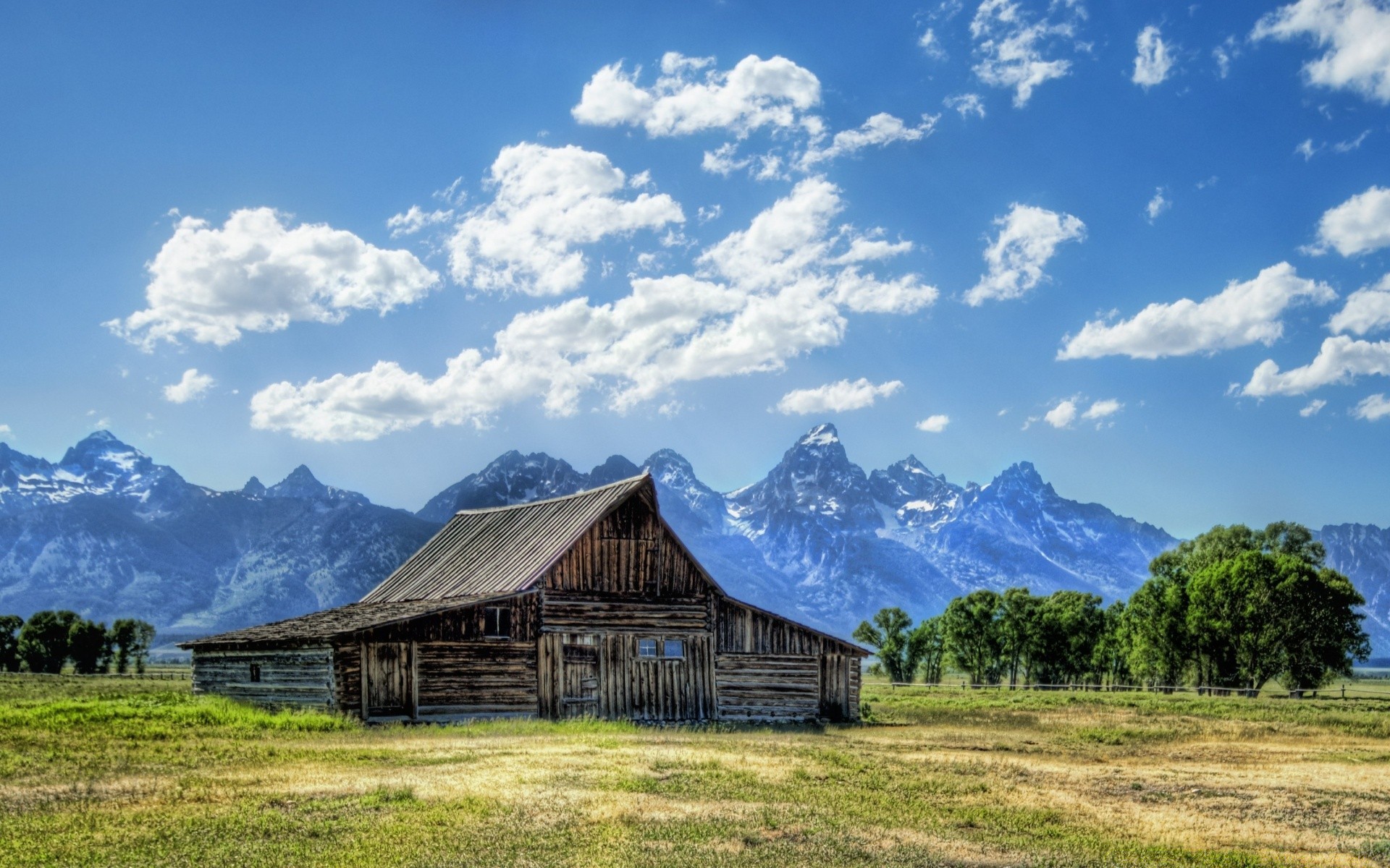 Krajobraz łąka z samotnym drzewem i górami o zachodzie słońca