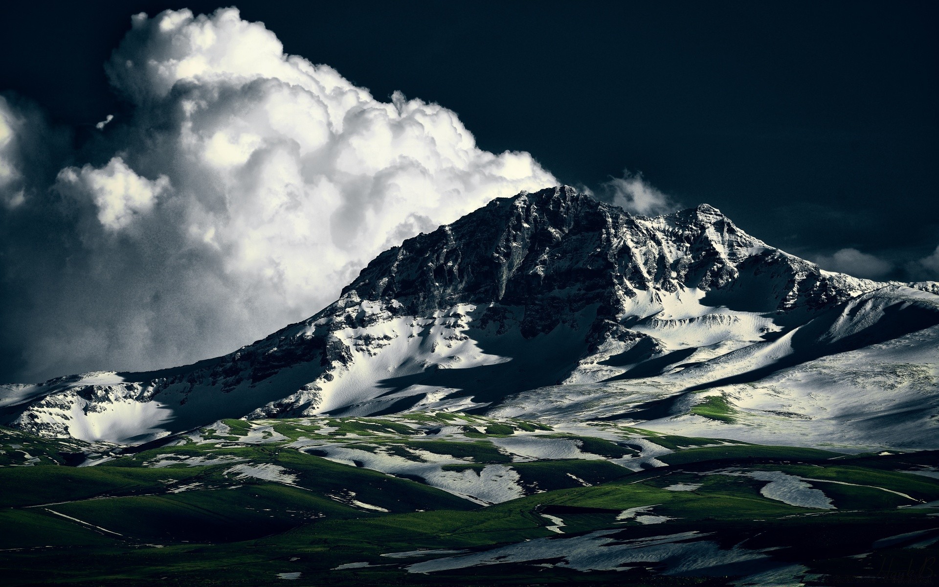 Zielono-biały krajobraz-śnieg, góry i chmury