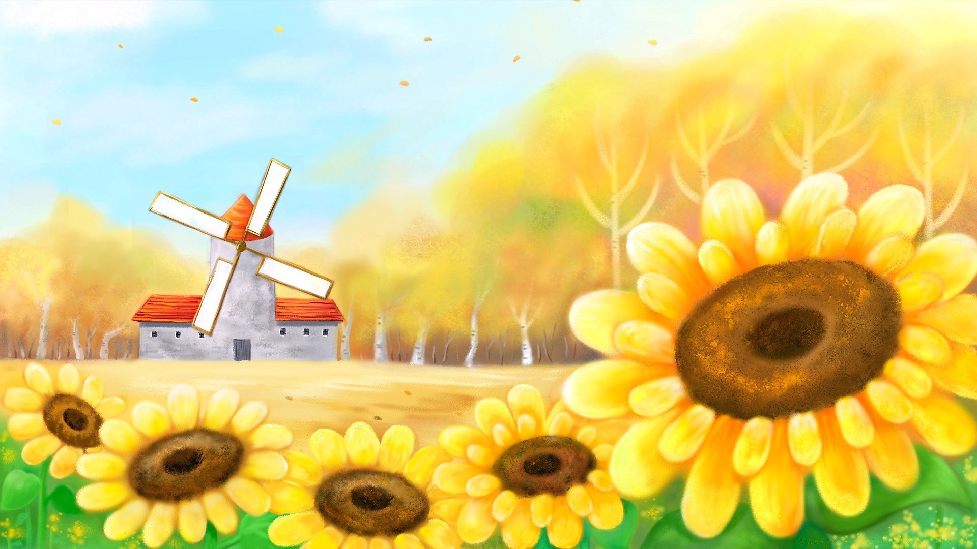 Rysunek żółtych słoneczników i Młyn