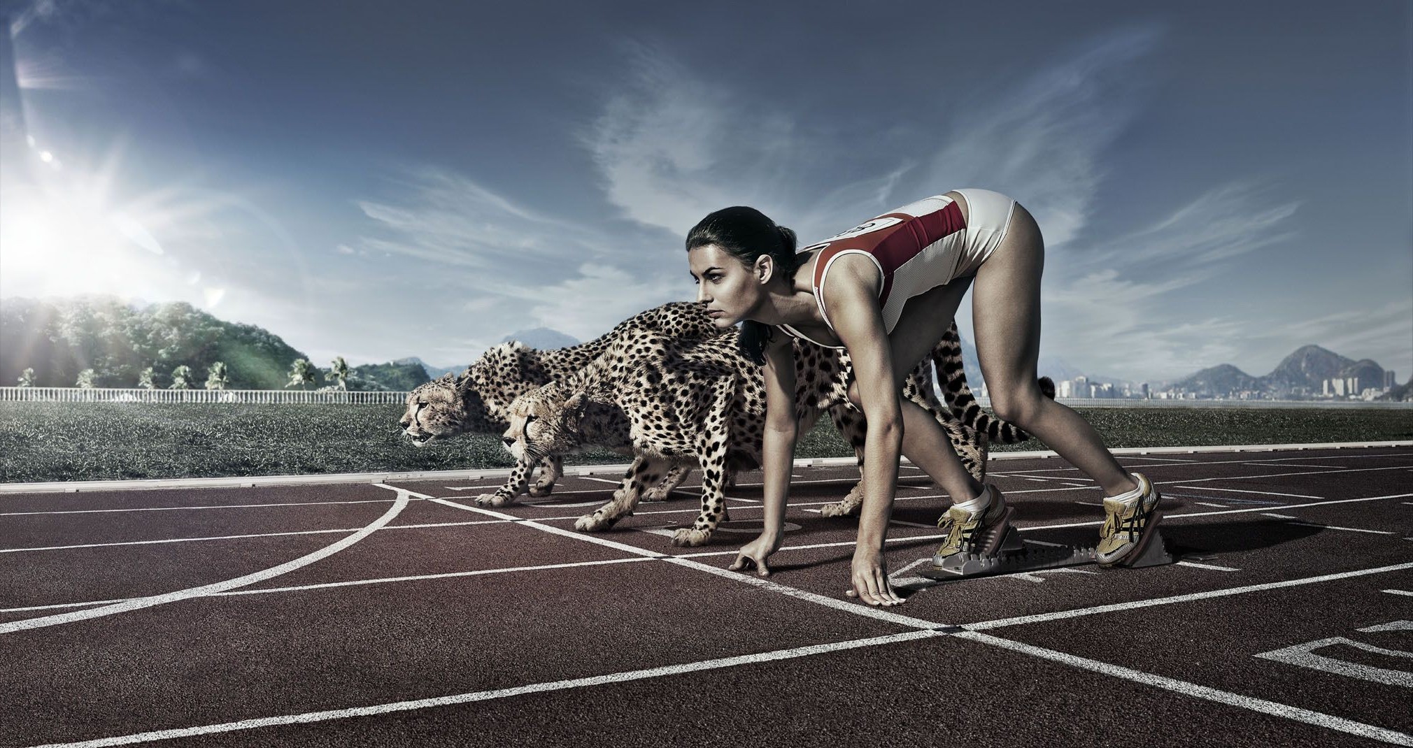 Dziewczyna zawodniczka na równi z gepardami na starcie