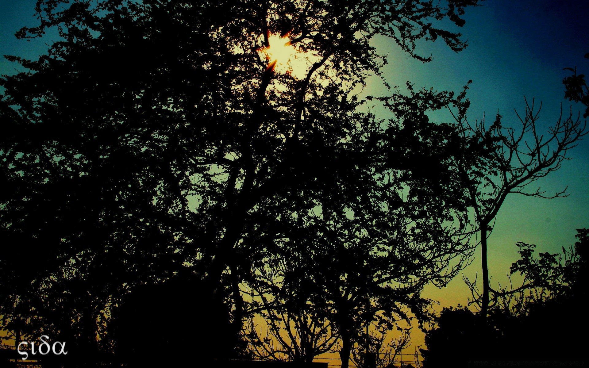 Czarne gałęzie na tle zielono-niebieskiego nieba