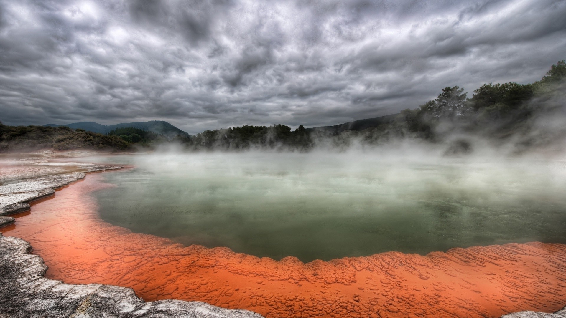 Mgła nad powierzchnią wody. Zachmurzone niebo