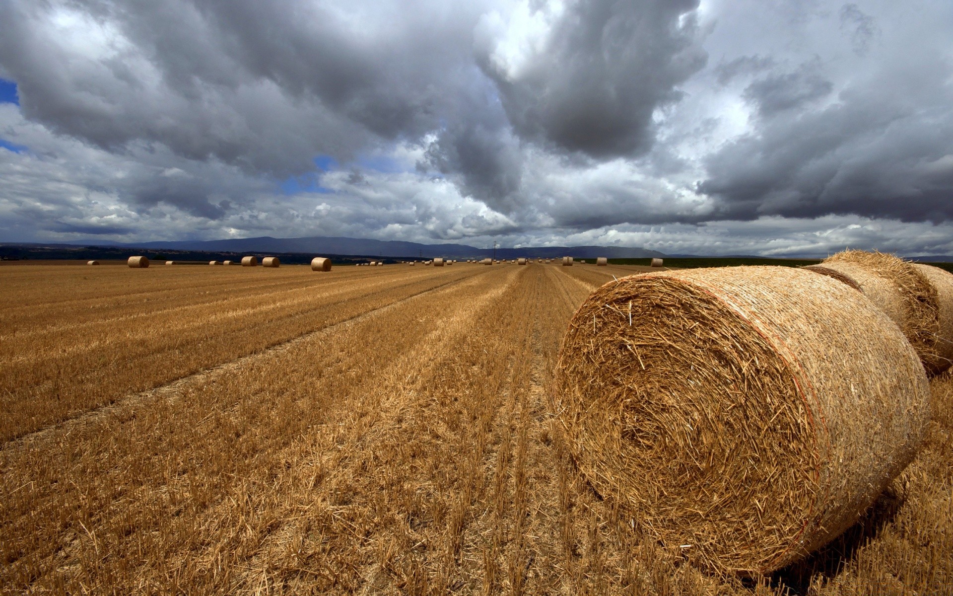 Stogi siana na skoszonym polu z krajobrazem pszenicy