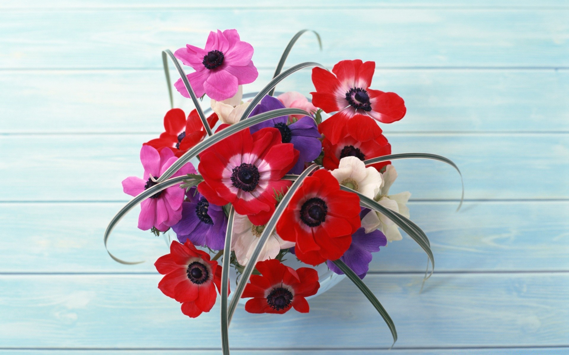 Bukiet kwiatów w doniczce i na niebieskim stole