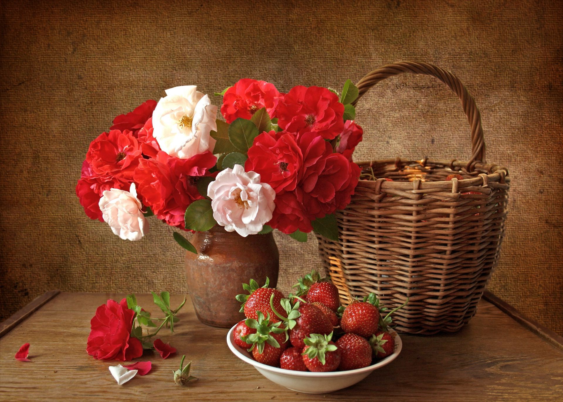 Bukiet kwiatów w wazonie. Martwa natura. Jagody