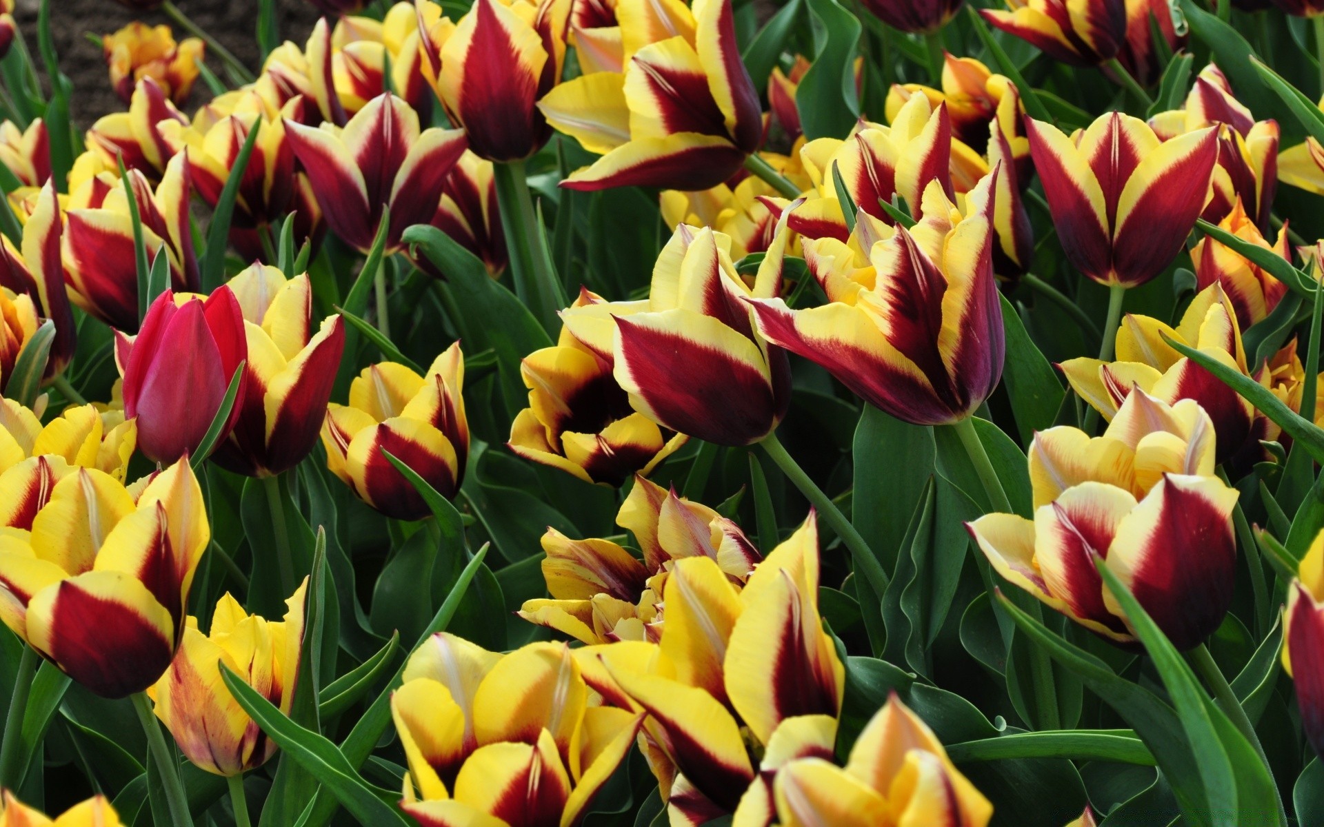 Czerwono-żółte tulipany kwitną na polu