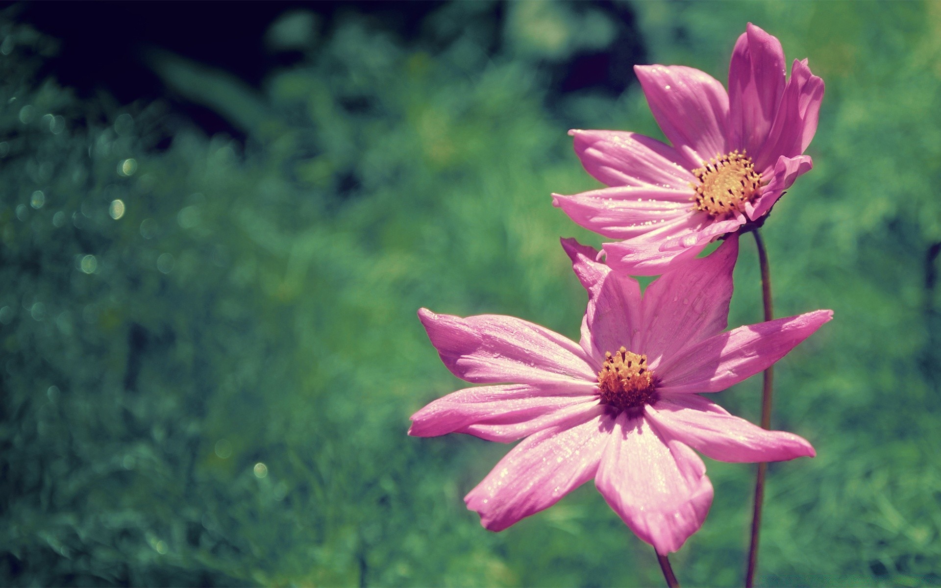 Dwa różowe kwiaty na rozmytym zielonym tle