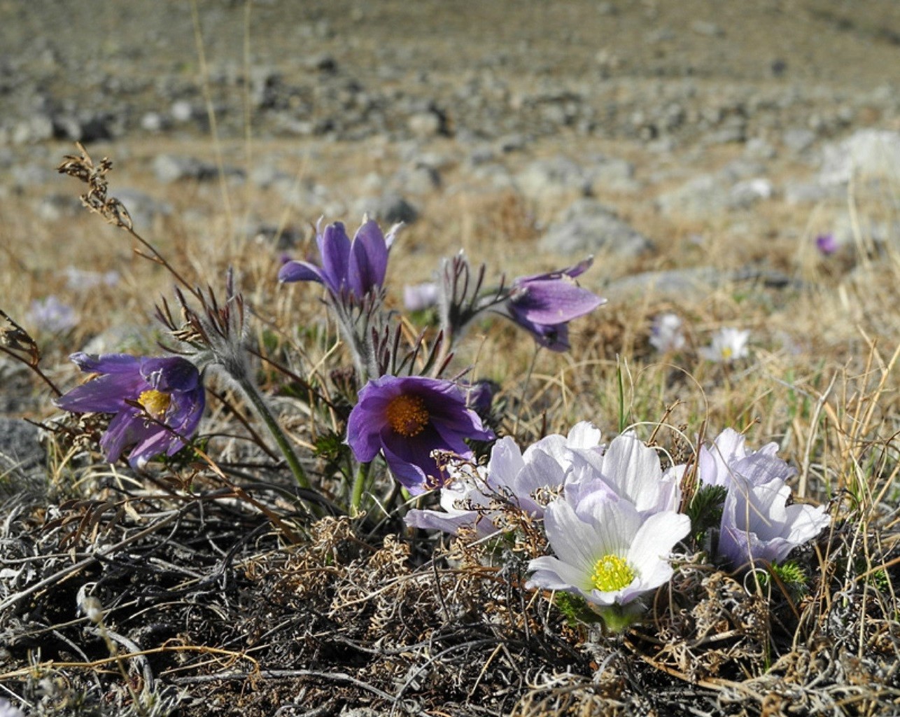 Białe i fioletowe kwiaty na tle szarego pola