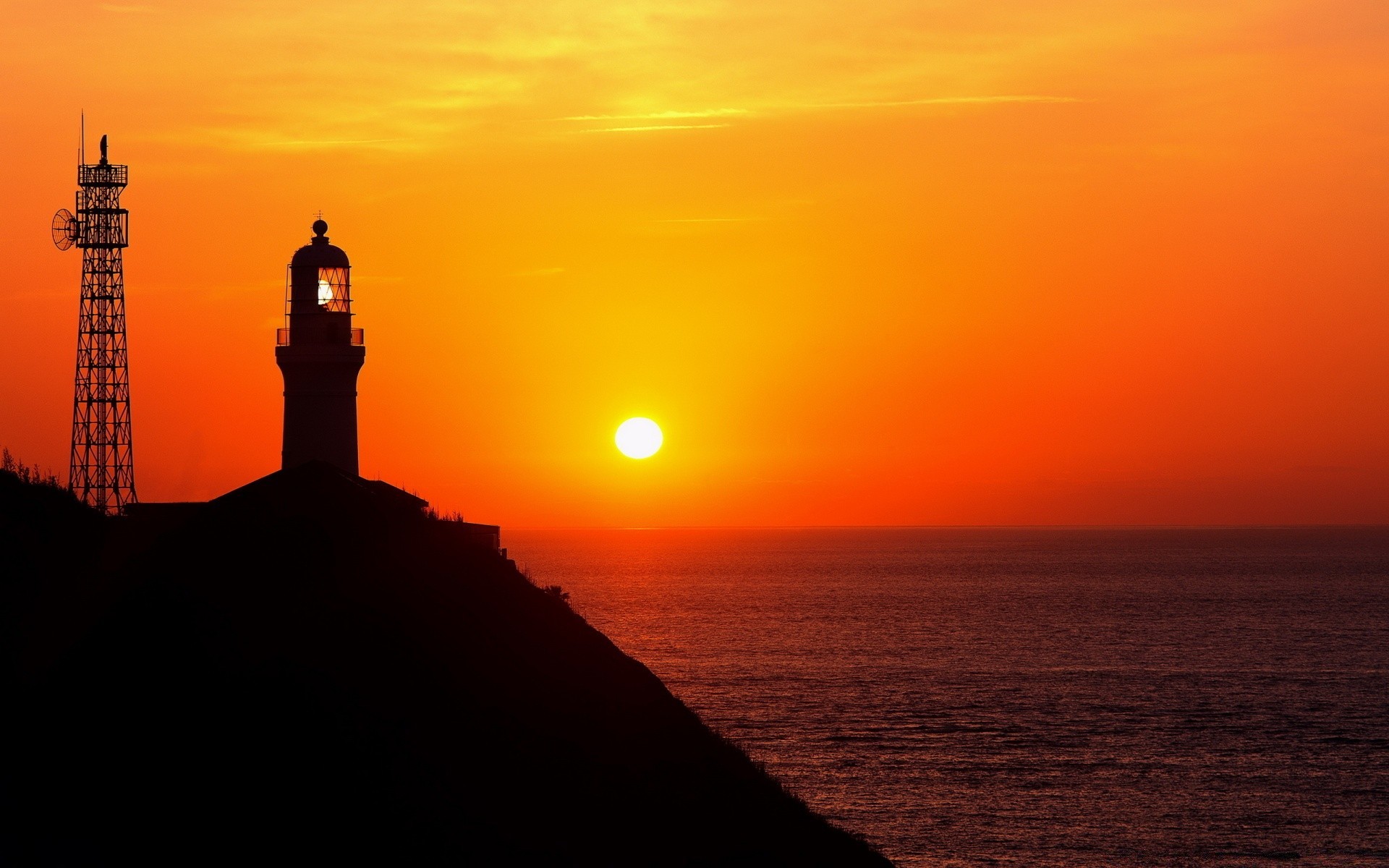 Latarnia morska na skale nad morzem w czerwonym świetle odchodzącego słońca