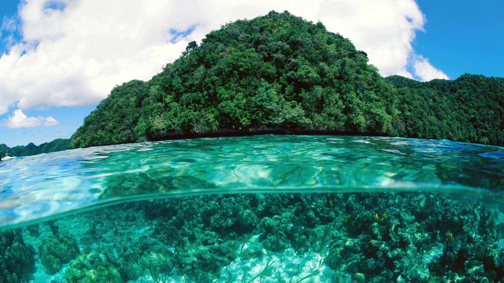 Tropikalny krajobraz z przezroczystą wodą i chmurami