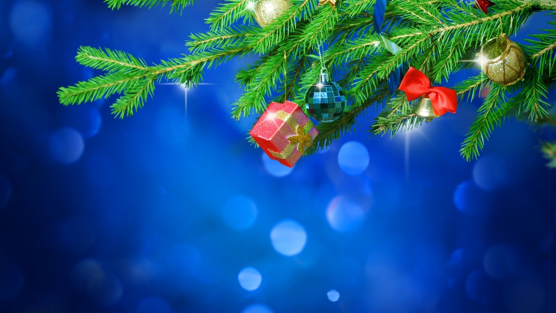 Zielona gałązka świerka z zawieszonymi na niej zabawkami na niebieskim tle