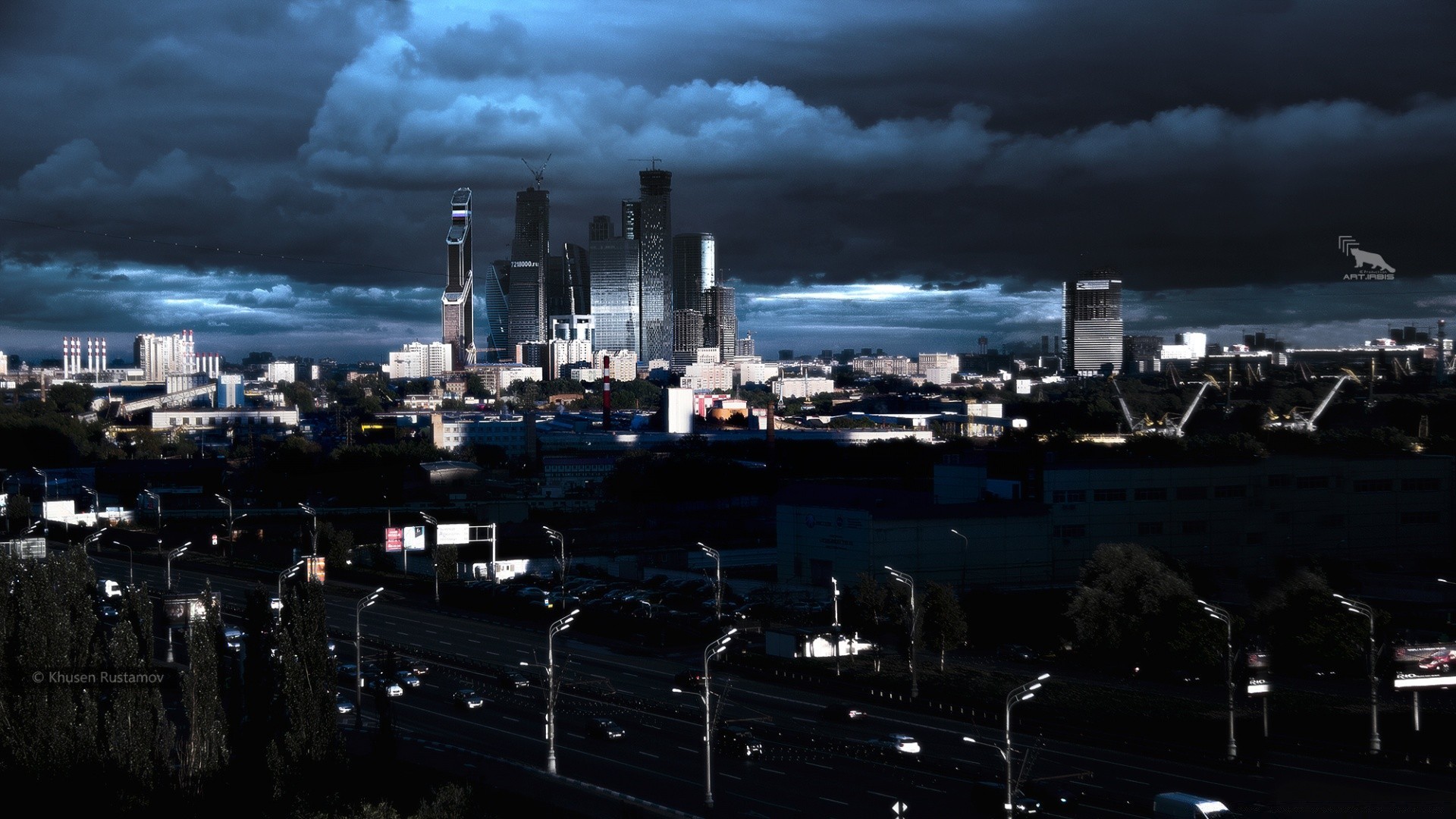 Miasto Skyline. Drapacze chmur spoczywają na niebie