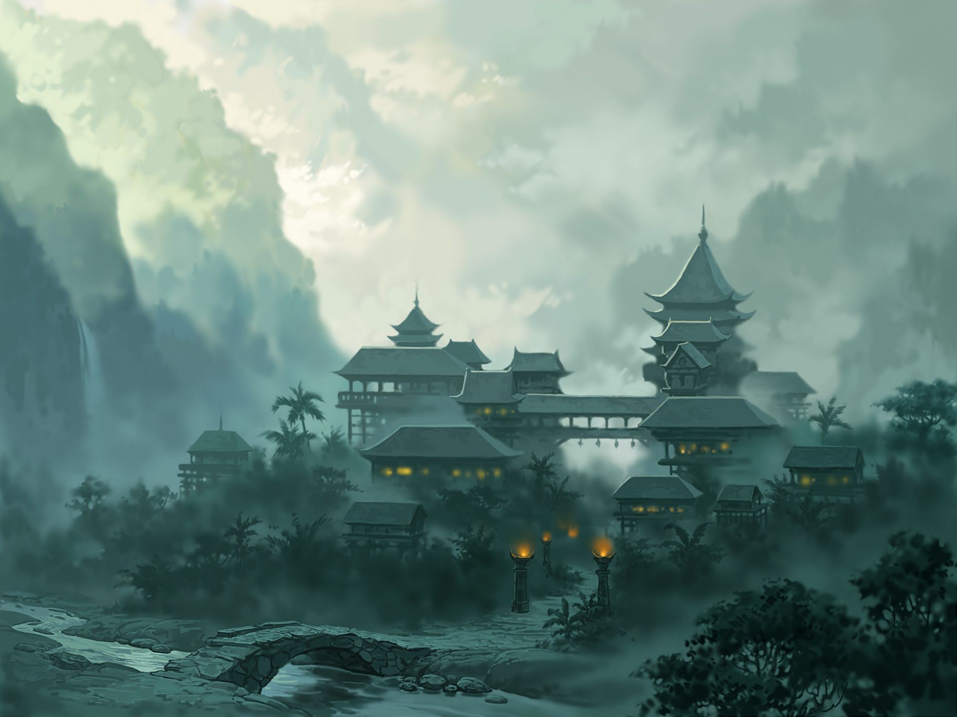 Jade dynasty Rzeka krajobraz mgła miasto góry most światła