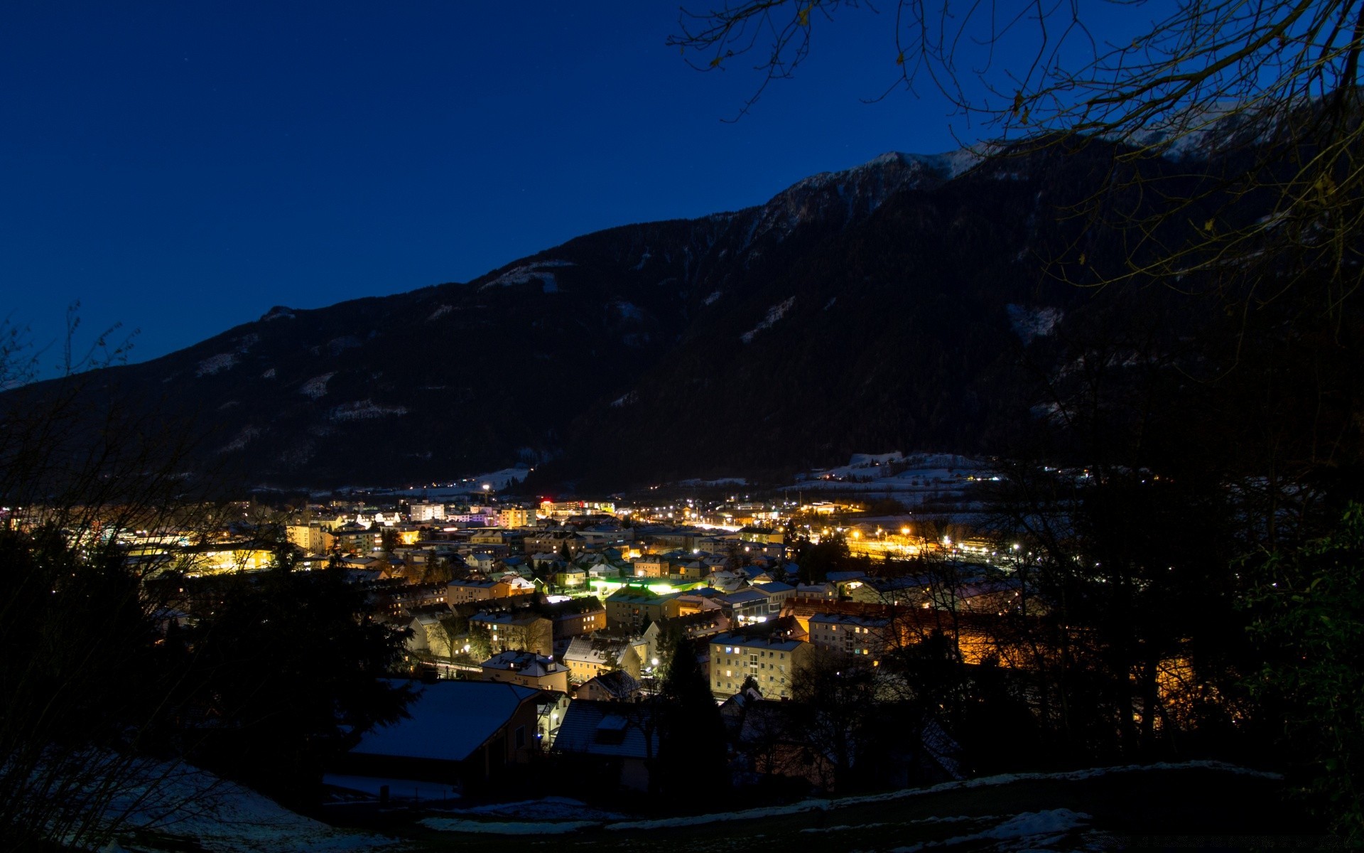 Miasto w Ameryce wieczorem kolorowo oświetlone