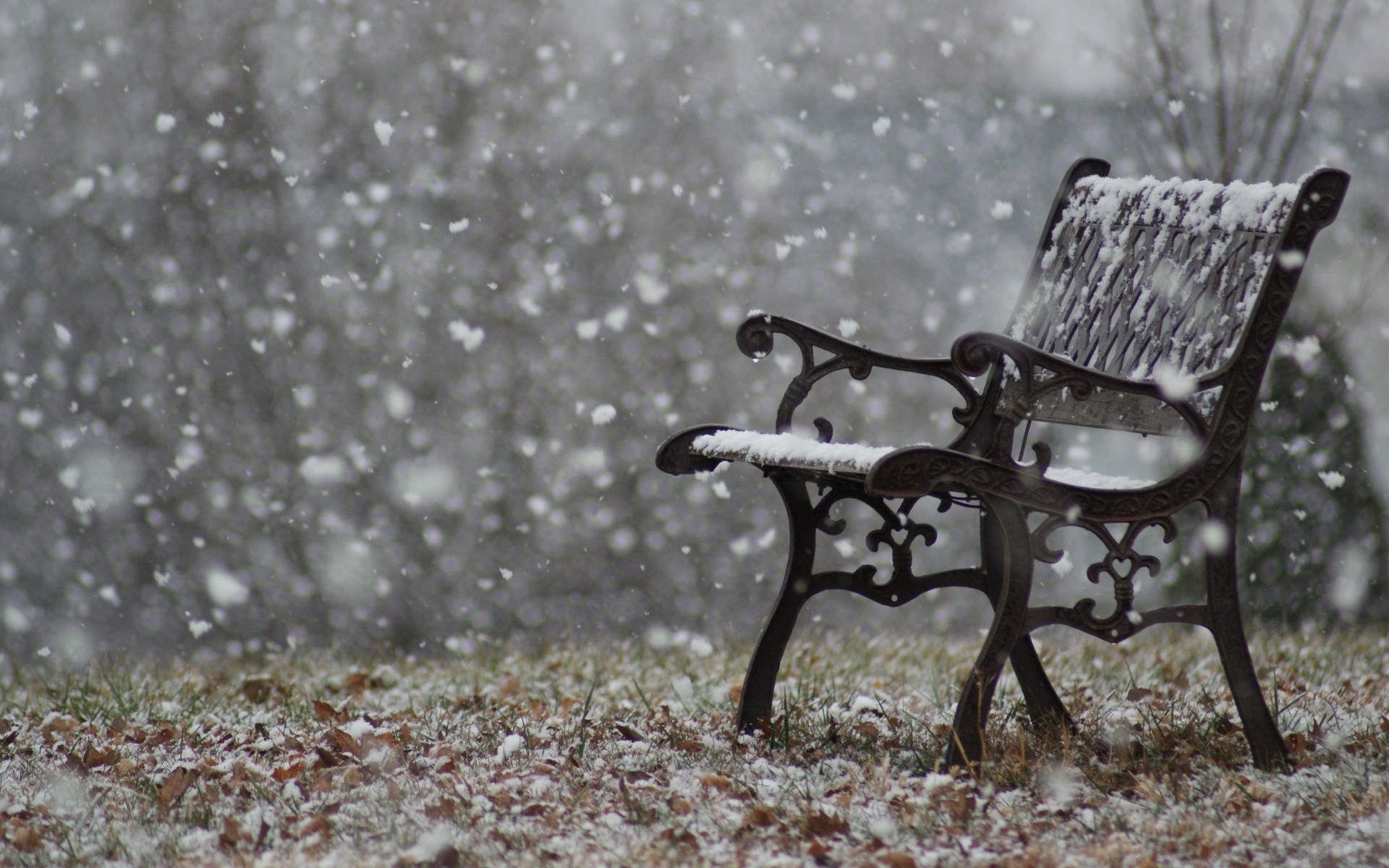 Samotna ławka pod płatkami śniegu