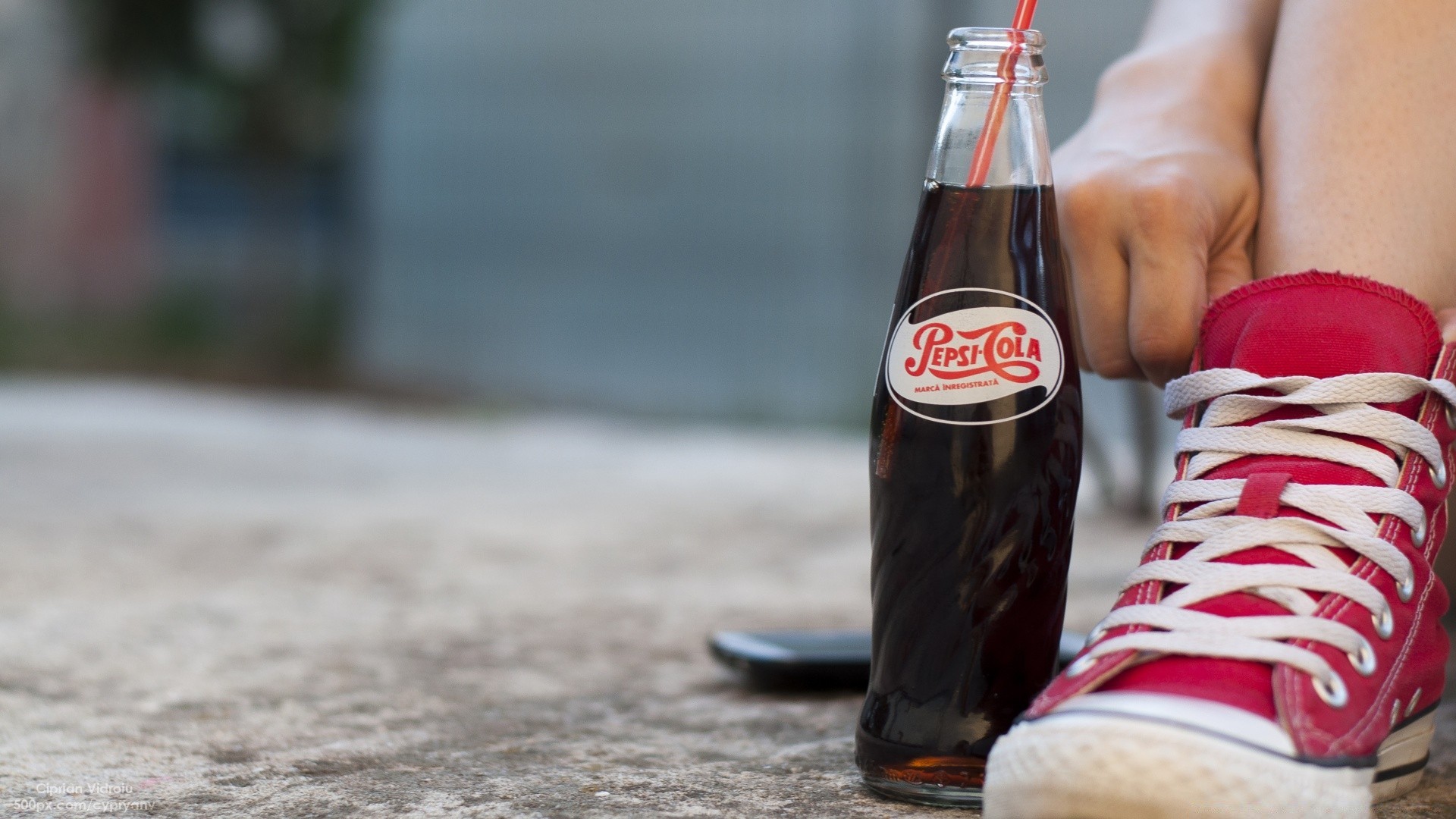Ktoś siedzi zrelaksowany w trampkach z butelką Pepsi Coli na betonie
