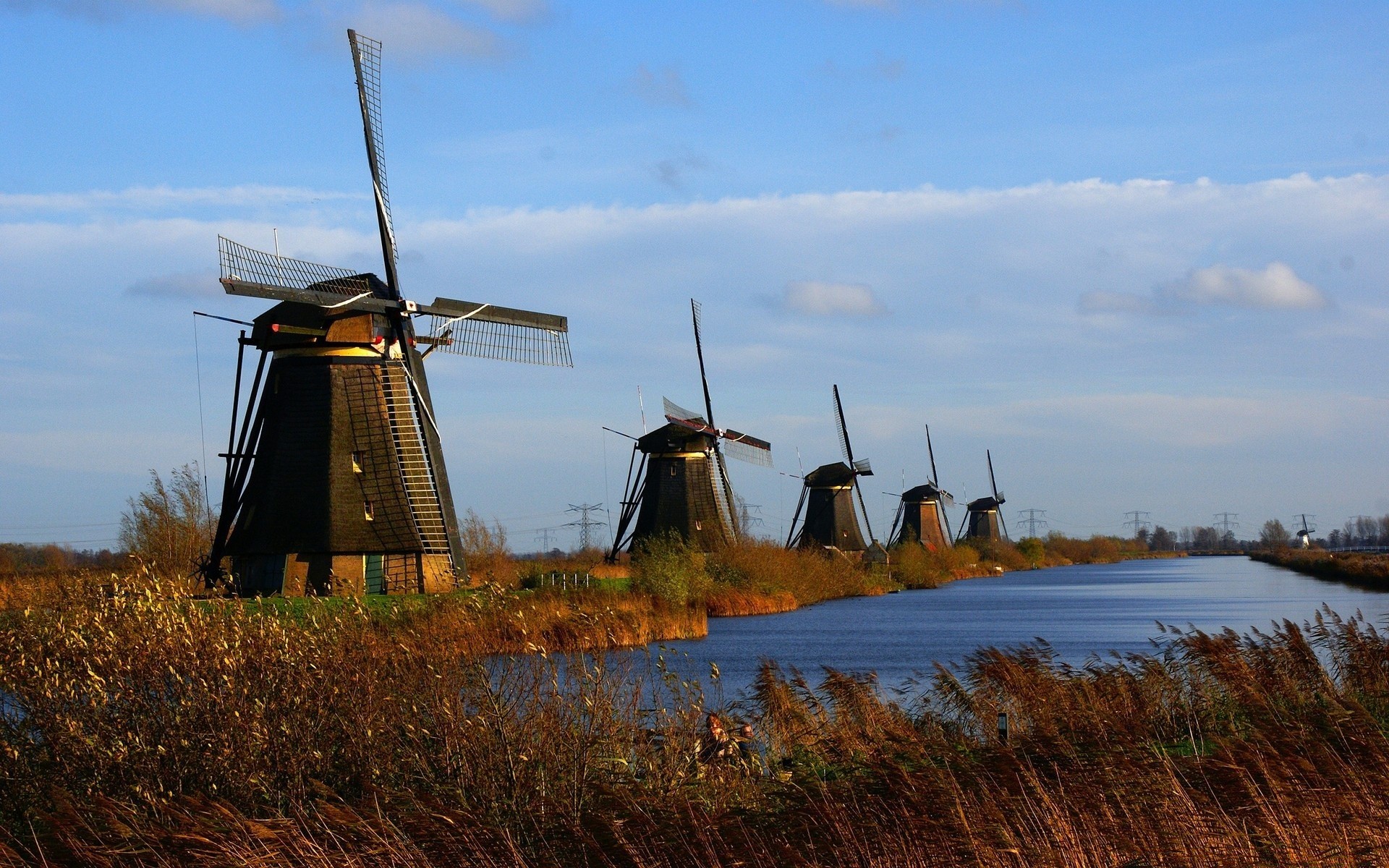 Wiatraki wzdłuż rzeki na jesiennym krajobrazie