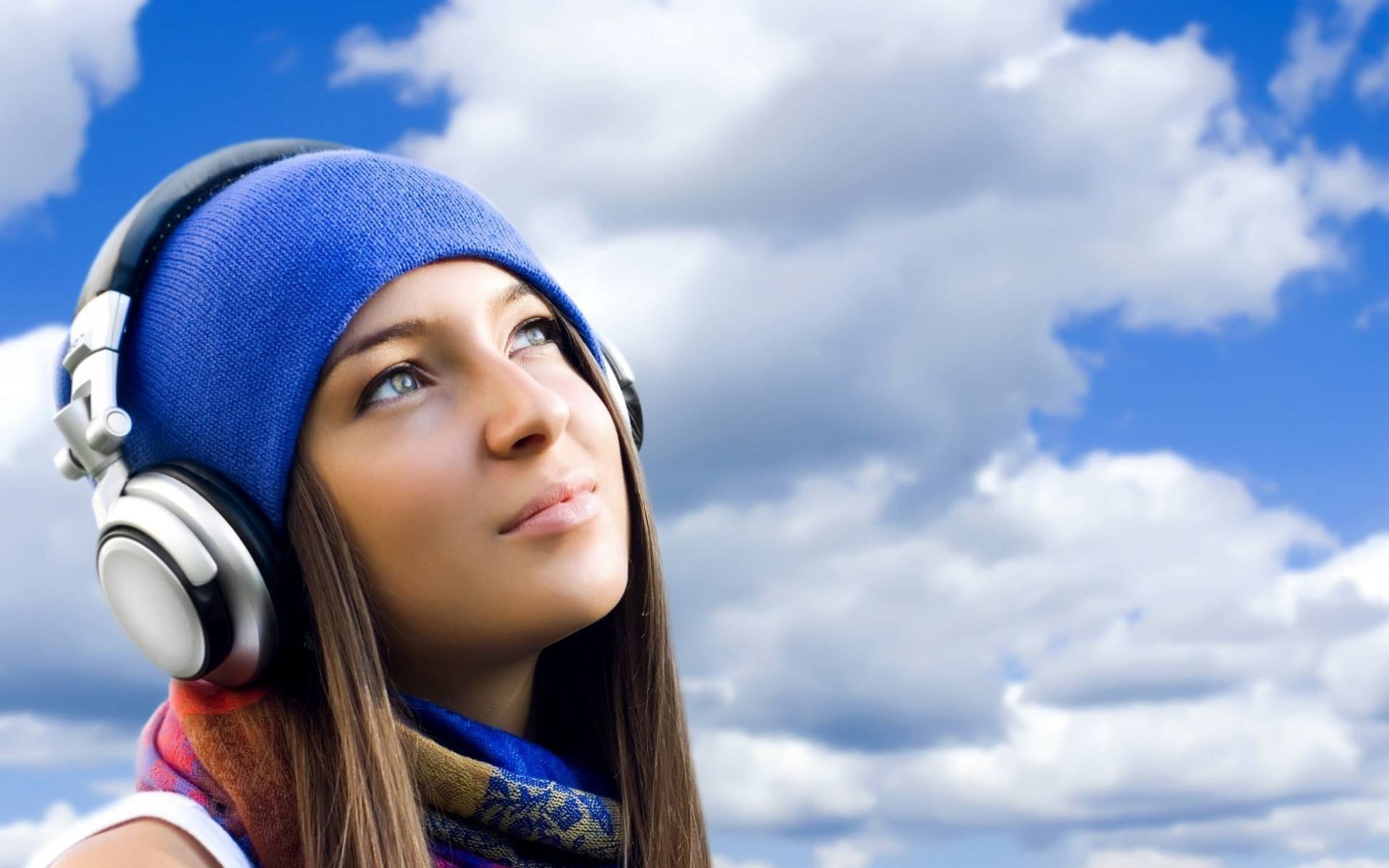 Dziewczyna w niebieskiej czapce słucha muzyki w słuchawkach