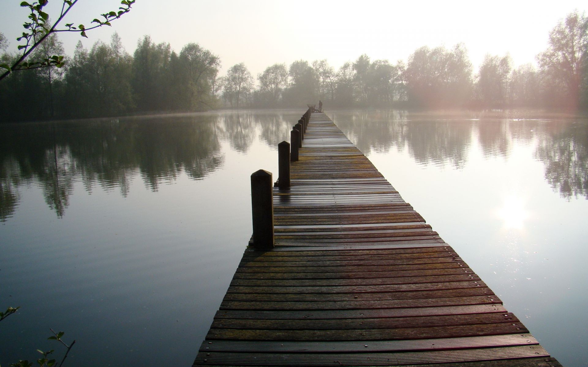 Most nad cichym jeziorem, odbicie drzew w spokojnej wodzie