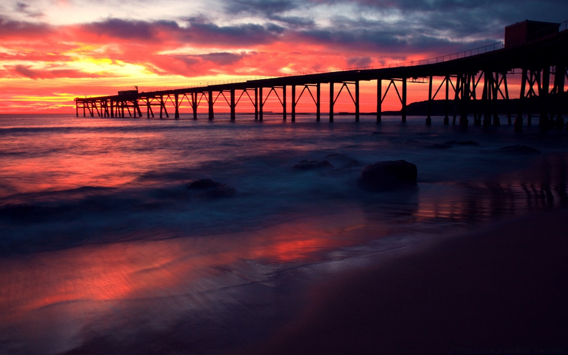 Most na tle oceanu i zachodu Słońca odbity w nim