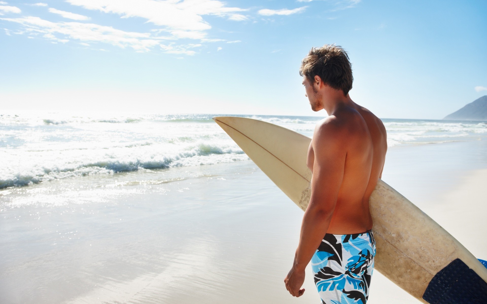 Mężczyzna z deską surfingową w ręku nad brzegiem morza