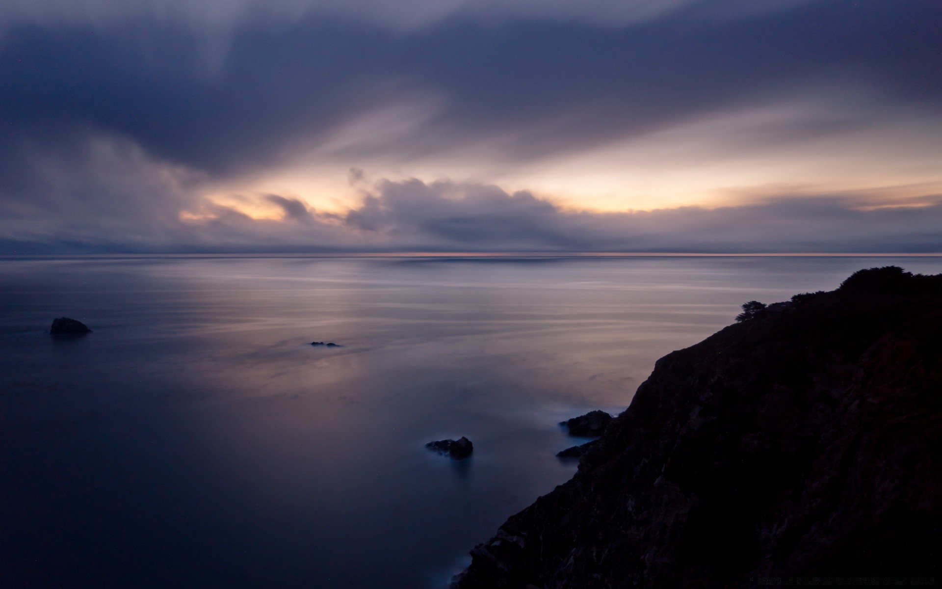 Spokojna, zimna niebieska powierzchnia morza i różowy świtSpokojna, zimna niebieska powierzchnia morza i różowy świt