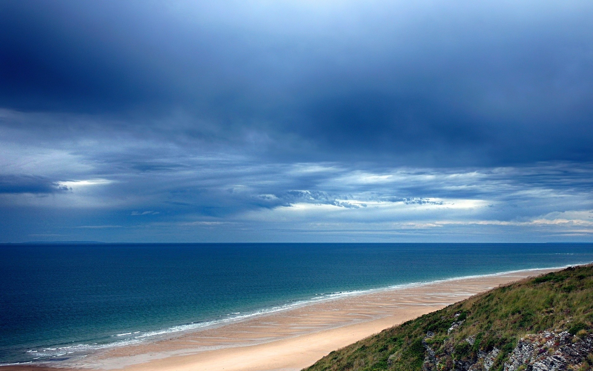 Brzeg morza. Horyzont. Ciemne niebo