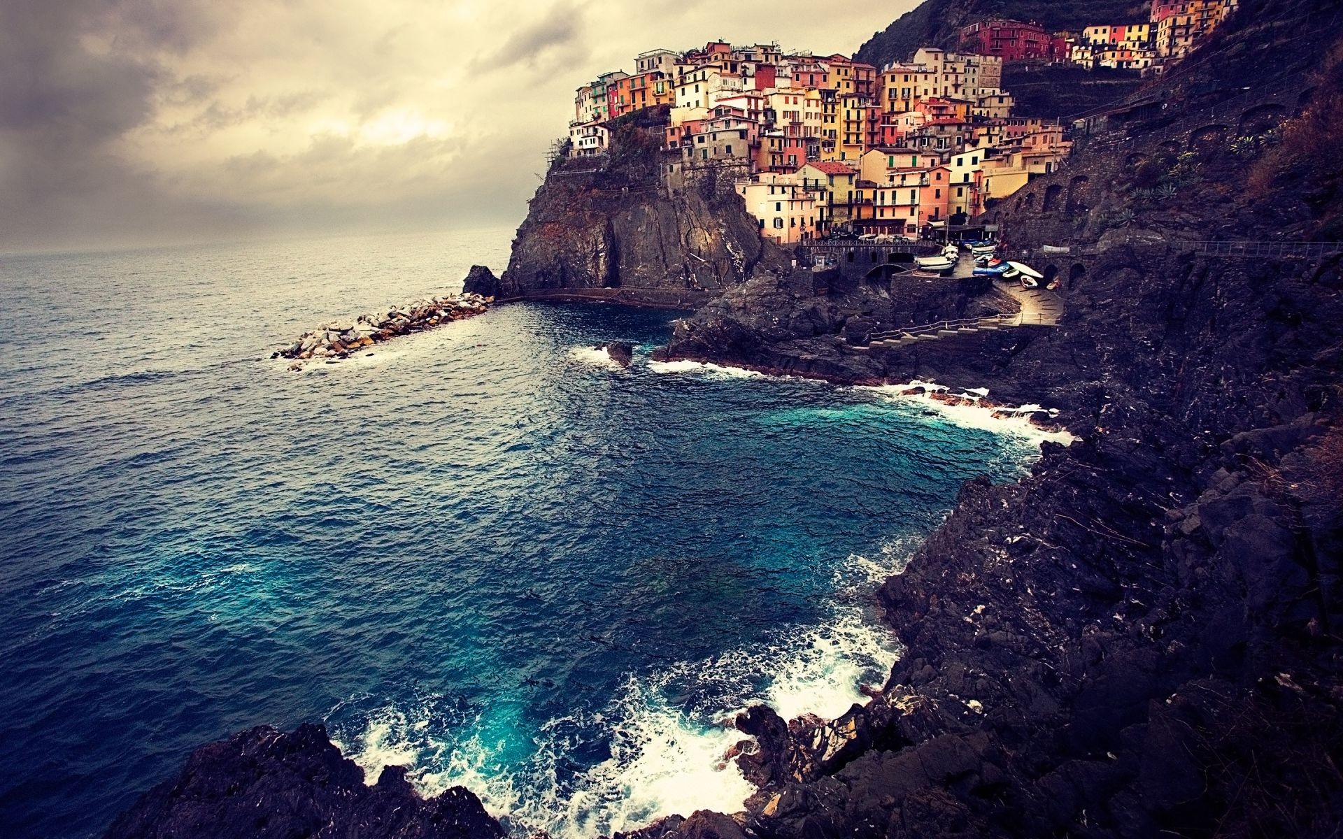 Domy na skale nad błękitnym morzem