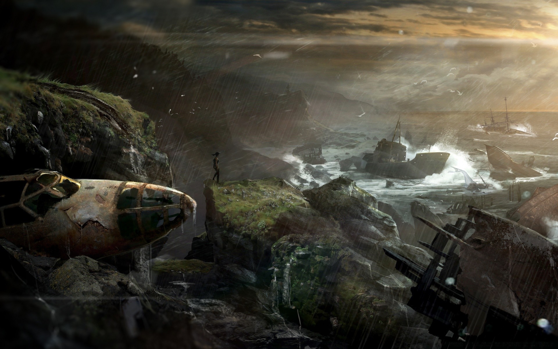 Szalejące morze i brzeg z porzuconymi statkami i innymi starymi maszynami