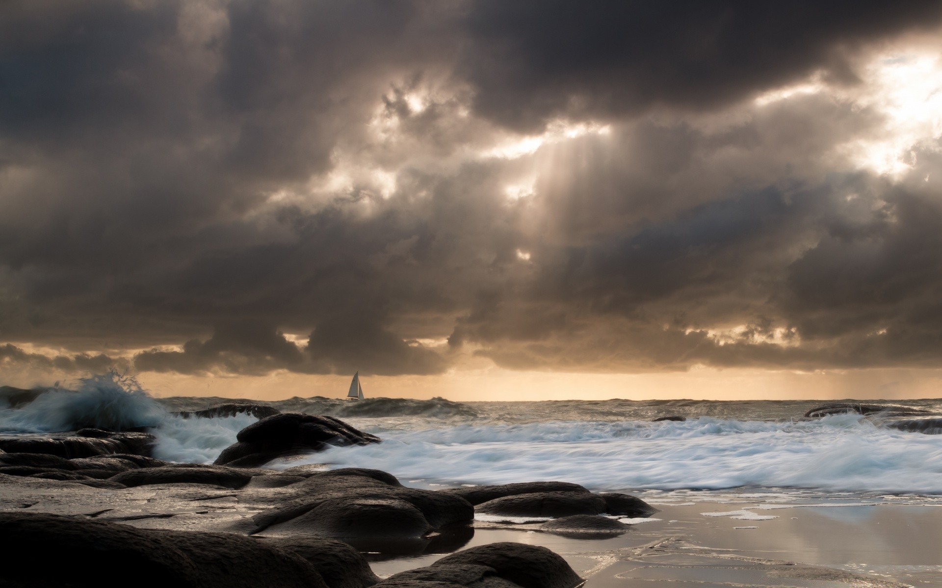 Morze. Ciężkie chmury. Żaglowiec