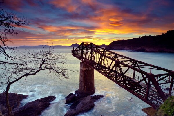 Most. Zachód słońca nad morzem. Piękny krajobraz