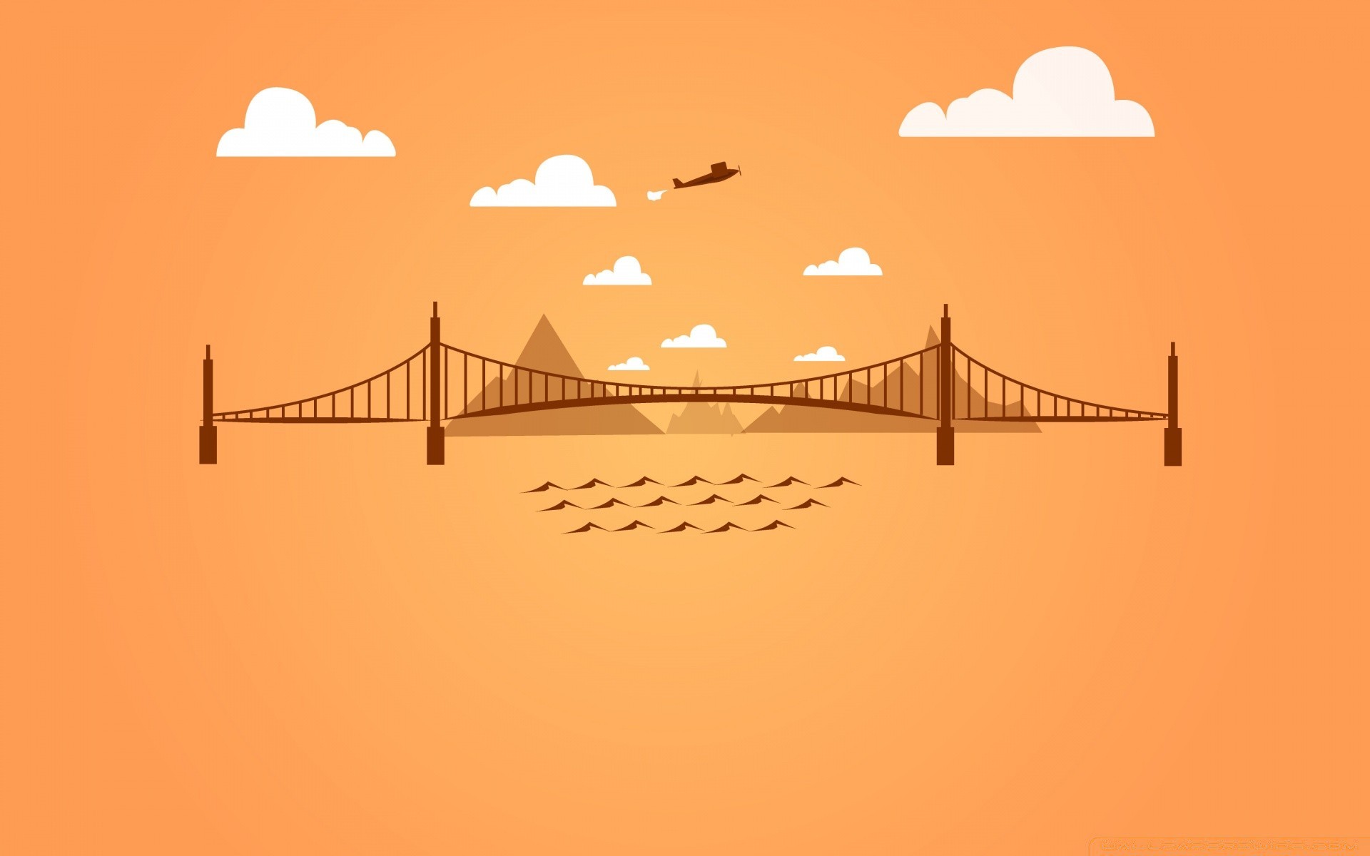 Na pomarańczowym tle białe chmury, czarny most, góry i fale
