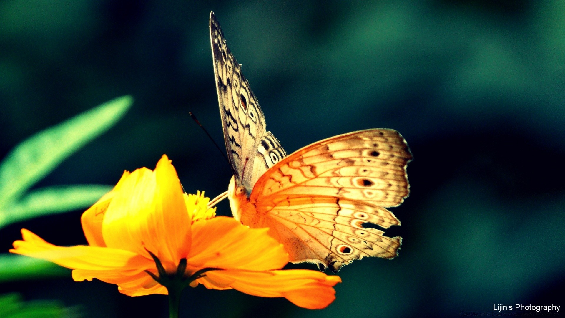 Czerwony motyl siedzi na gałęzi żółtych kwiatów