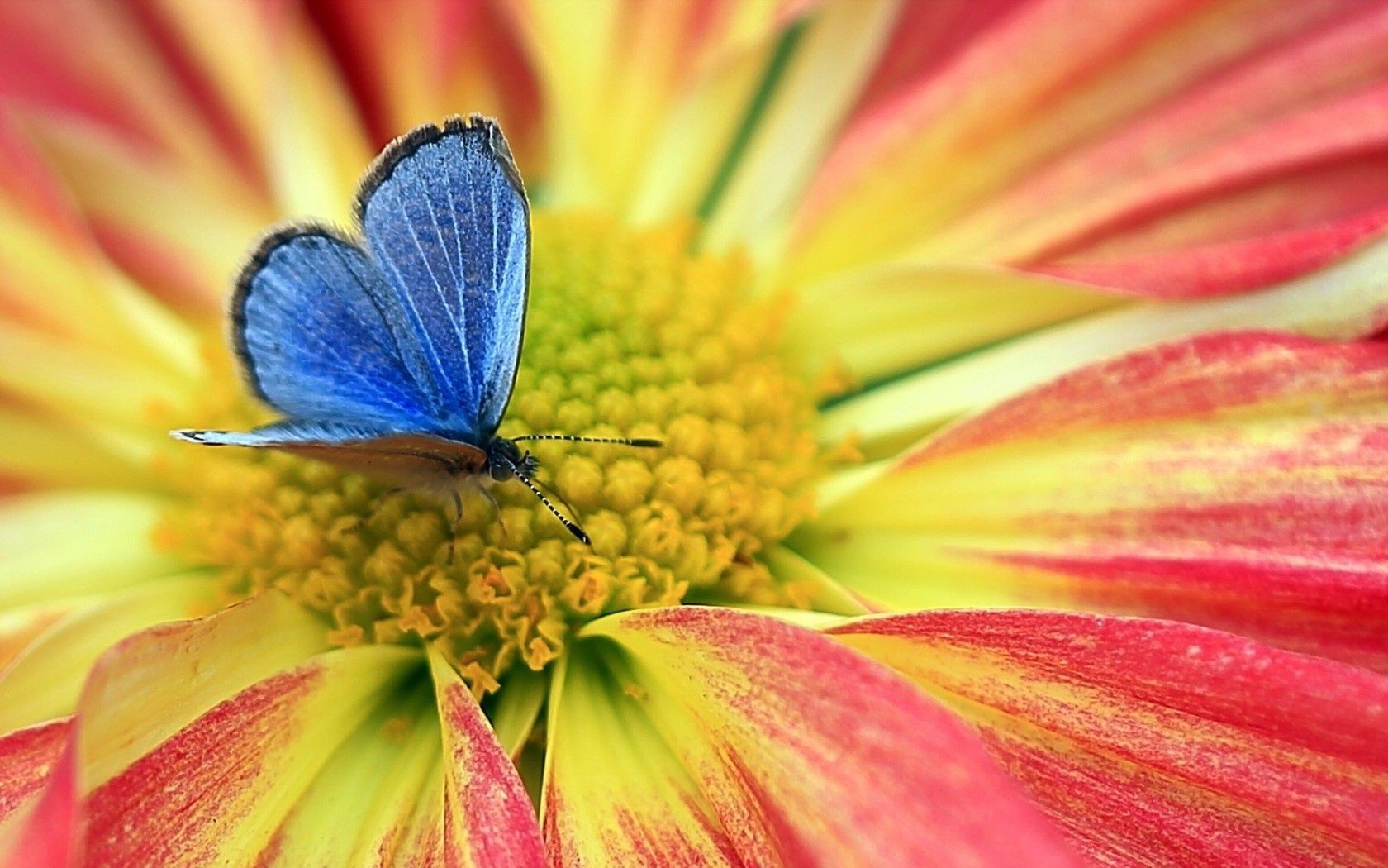 Pomarańczowy motyl siedzi na różowym kwiatku