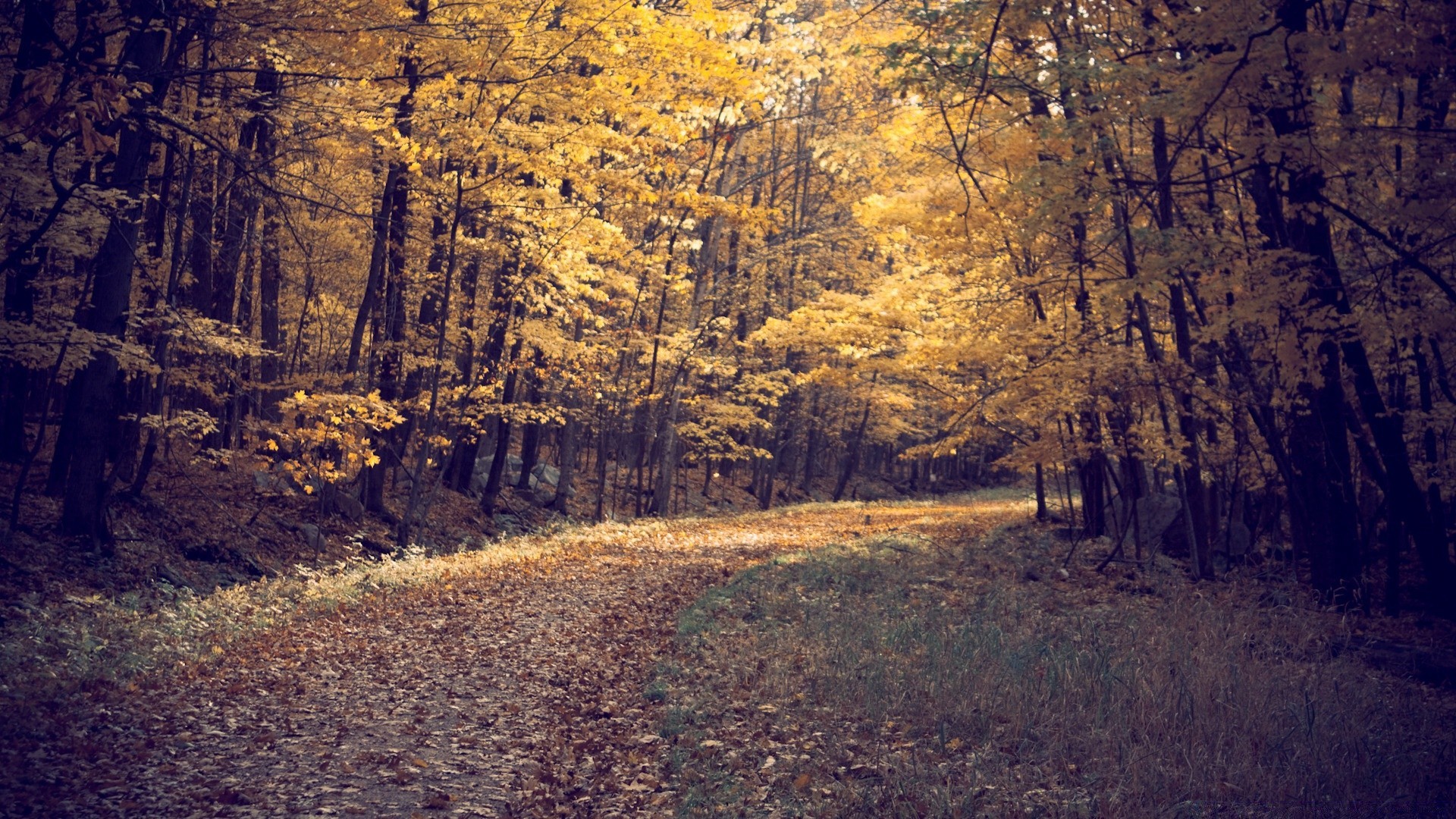 Jesienny las. droga jest pokryta jesiennymi liśćmi